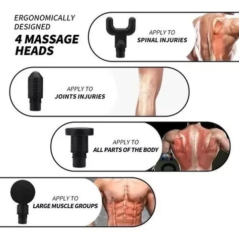 Herramienta de recuperación muscular, ofrece lo que se conoce como terapia de percusión o vibración. Este tipo de masaje proporciona ráfagas rápidas de presión en el tejido muscular del cuerpo a medida que el cabezal oscila de un lado para otro. @@CARACTERÍSTICAS @@• Vibración de alta frecuencia de 6 velocidades: el masajeador puede reducir efectivamente la rigidez y el dolor muscular, aumentar el flujo sanguíneo y el rango de movimiento, y mejorar la salud de los tejidos blandos del cuerpo. @• Diseño de vibración multifrecuencia: ajuste de 6 velocidades, diferentes configuraciones de marcha, 2-3 horas de duración de la batería, 3200 latidos por minuto. @• Batería de litio recargable: equipada con una batería de litio recargable, que puede usarse durante aproximadamente 2-3 horas después de la carga. @• Bajo nivel de ruido: potente motor sin escobillas, bajo nivel de ruido y gran potencia. @• Chip de control inteligente: chip de control inteligente AI; sistema de retroalimentación de presión incorporado; Puede ajustar automáticamente la velocidad del motor y la potencia de salida de acuerdo con la presión del masaje, más humanizado e inteligente. @@POR TU COMPRA RECIBES @@• Masajeador de Fascial Gun. @•Cabeza Redonda. @• cabeza en forma de U. @• cabeza cilíndrica. @• cabeza plana. • cable de carga.